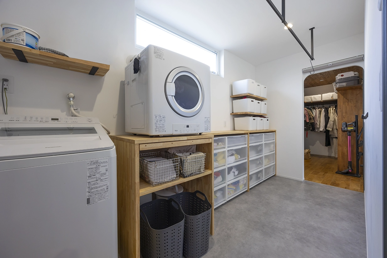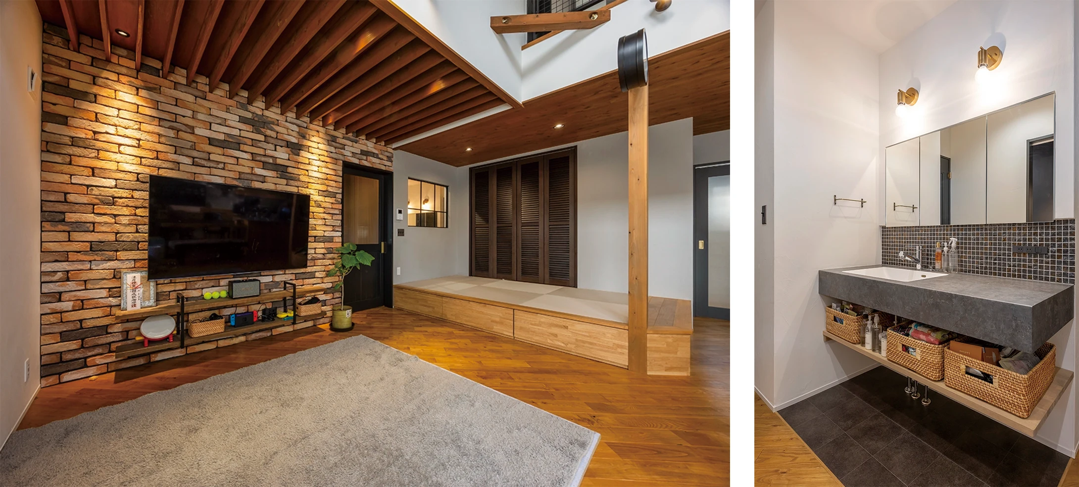 生活動線も、実用性をしっかりと意識。洗面と脱衣室を分けることで、家族の使いやすさを高めながら、玄関から水まわり、そしてファミリークローゼットへとスムーズにつながる設計に。夫婦で楽しみながら選んだ照明など、随所にIさん家族らしさが感じられる住まいです。