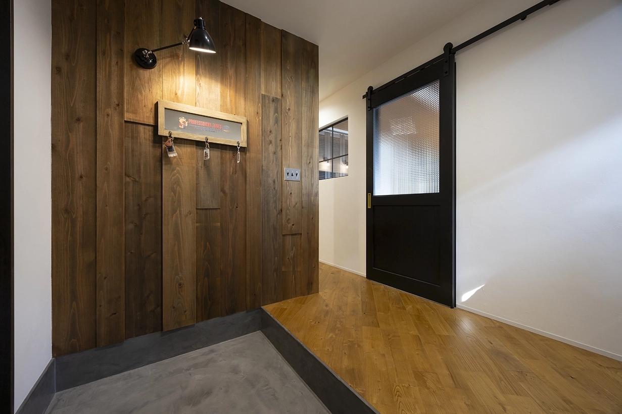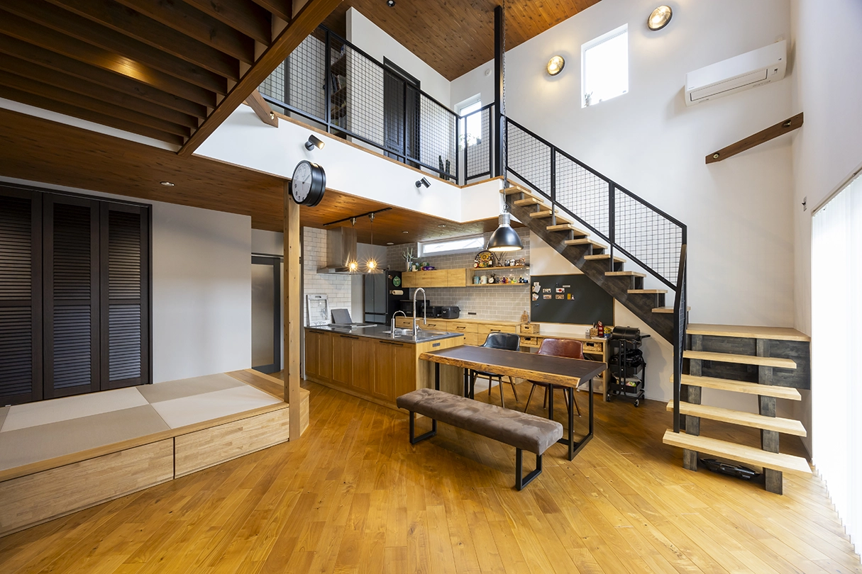 玄関を開け、正面に現れる造作ドアを開けると見えるのは、まるでカフェのように洗練されたキッチンと、インダストリアルなインテリアでまとめられたLDKです。塗り壁の質感と、無垢材のぬくもりが調和する空間には、Iさん夫妻の“本物の素材”へのこだわりが詰まっています。リビングの吹き抜けと、その先に抜ける窓がもたらすのは、空とのつながりと、のびやかな開放感。光の通り道まで丁寧に考えられた設計が、リビングでの時間をやさしく包み込みます。